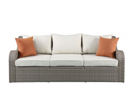 Three Piece Outdoor Gray Wicker Sectional Seating Group with Beige Cushions