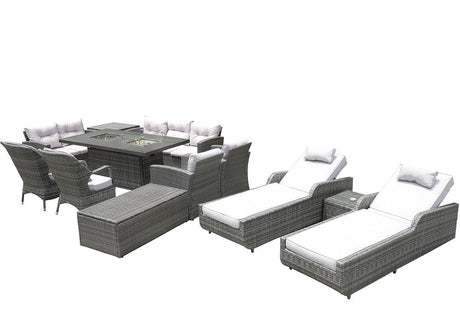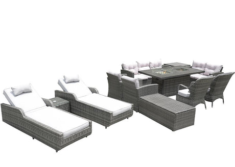 Twelve Piece Outdoor Gray Wicker Multiple Chairs Seating Group Fire Pit Included with White Cushions