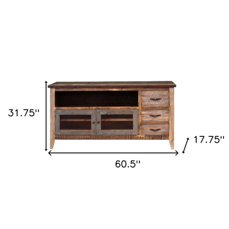 61" Brown Solid Wood Cabinet Enclosed Storage Distressed TV Stand