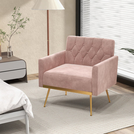 Modern Velvet Accent Chair with Button Tufted Back Golden Metal Legs and Adjustable Foot Pads-Pink
