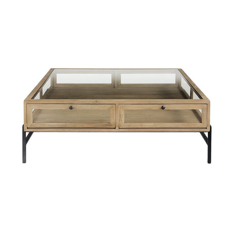 42" Clear and Black Glass and Metal Square Coffee Table With Two Drawers And Shelf