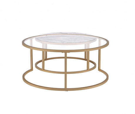 Set of Two Clear White and Gold Glass And Faux Marble And Iron Round Frame Nested Coffee Tables