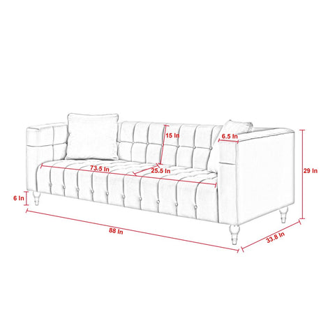 69" Beige Velvet Sofa And Toss Pillows With Dark Brown Legs