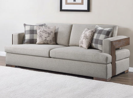 92" Beige Fabric Sofa And Toss Pillows With Brown Legs