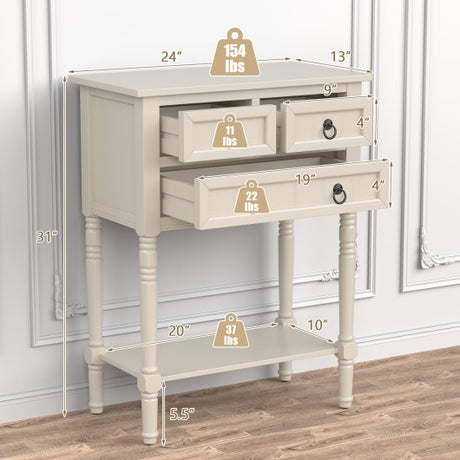 Narrow Console Table with 3 Storage Drawers and Open Bottom Shelf-Beige