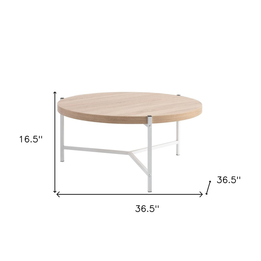37" Natural And White Metal Round Coffee Table