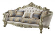 40" Antiqued White Velvet Curved Floral Sofa And Toss Pillows With Champagne Legs