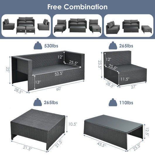 —� No Assembly Needs and Free Combination: This patio set has been fully assembled. The patio set includes: 1 x loveseat (60" x 28.5" x 73") 2 x armless sofas (27" x 28.5" x 23.5") 2 x ottomans (21.5" x 21.5" x 10.5") and 1 x coffee table (43.5" x 23.5" x 12.5"). There is no limit of combination and you can use each piece separately.
