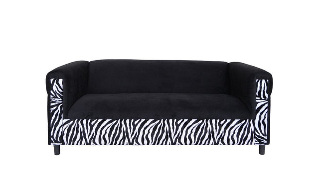 Add an air of fashion to your space with this fabulous 72-inch black and white velvet zebra sofa. This striking sofa features solid black and a zebra print made from sturdy and resilient velvet that has a warm and rich look and is a super soft and comfortable to the touch. Sinuous springs construction gives this piece strong support and makes it comfortable to sit even for long periods of time. Square arms offer a comfy place to rest. Black solid wood legs effortlessly elevate the seating off the floor and add a touch of contemporary design. A great showpiece for your room, this sofa is a must have. 25-inch h x 72-inch w x 34-inch d.