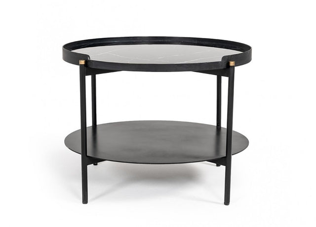 24" Black Faux Marble And Metal Round Coffee Table With Shelf