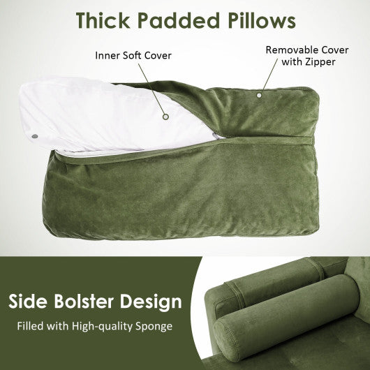 The detachable structure allows for free combination. Army green suede fabric and sponge filling ensure soft touch and a comfortable sitting experience. To offer more comfort we also design it with soft back pillows and side bolsters. Besides the steel backrest has USB ports 3-hole socket (2-seat sofa does not include the above functions) hidden storage space and fixing knobs. Distributed elasticity system ensures super comfort and long-term use. Solid metal legs with pads ensure high durability and stability. Moreover side pocket provides extra storage. Our sofa couch with removable structure is easy to combine.
