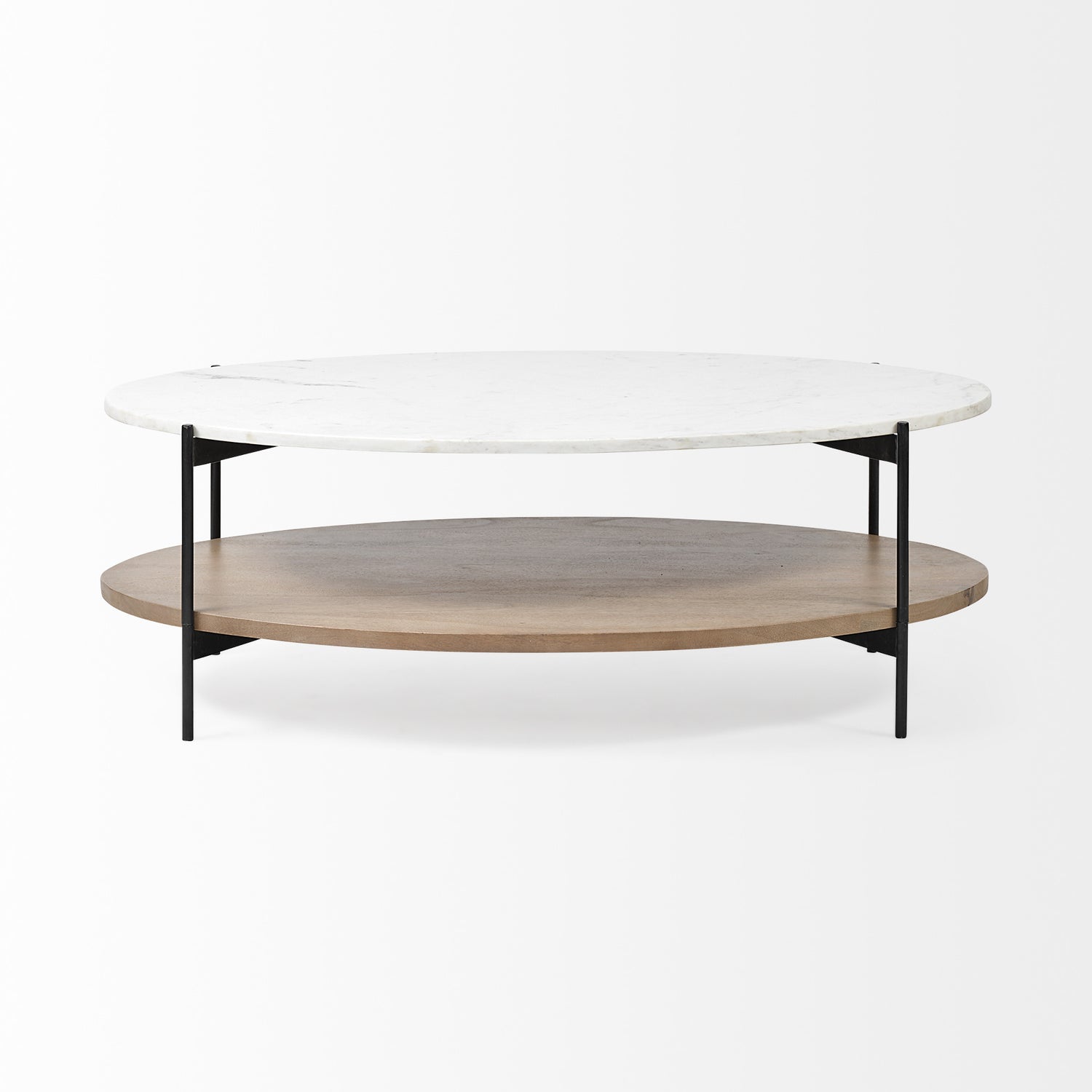 48" Brown and Black Genuine Marble and Metal Oval Coffee Table With Shelf