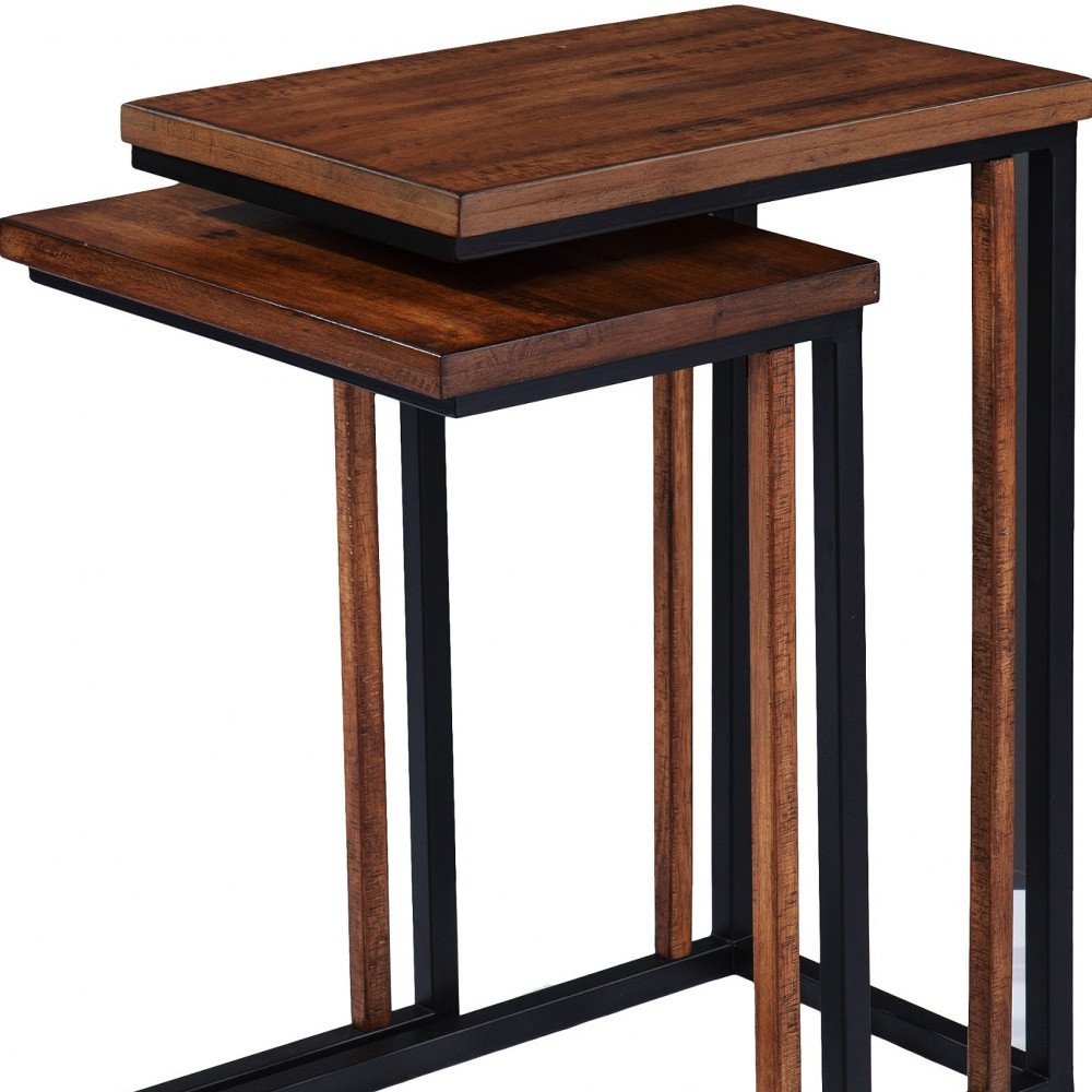 Increase your decorating options with this set of two 25" brown solid wood rectangular nested end tables that will enhance your space. This pair makes the ideal companion for flanking the sofa or bed and can be used together or separately as you choose. This table features a modern and versatile C-shape and features rustic brown tops. This modern set nests easily together when not in use. A great accent on either side of the sofa or bed, this adorable end or side table is just what you need. You can also use it as an entryway table to hold your keys. 24.75" H x 18.25" W x 12" D
