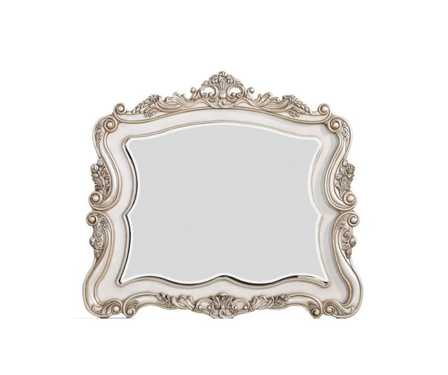 Enrich your bedroom with an ornament thats fashionable and unique at the same time with this 44-inch white novelty solid wood framed dresser mirror. The frame of this mirror is made from solid wood which has a antique white color to it. This mirror has a novelty shape providing the most magnificent reflections of light and color. This mirror makes your bedroom glow with its fantastic frame. The mirror of traditional style can also decorate your room and bring brightness to your living space. Due to its high quality construction, it will last a lifetime. To create a stylish and comfortable atmosphere for your sleeping area, this large mirror is the smart choice to further enhance the look of your bedroom. 44-inch H x 50-inch W x 2-inch D