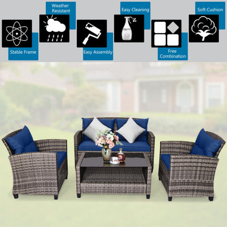 4 Pieces Patio Rattan Furniture Set Coffee Table Cushioned Sofa-Navy