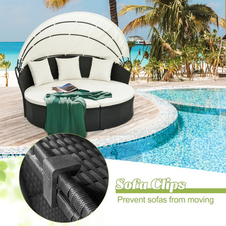 Clamshell Patio Round Daybed Wicker with Retractable Canopy and Pillows-Off White