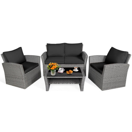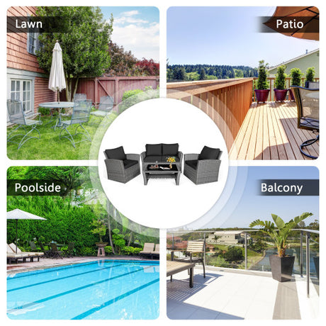 4 Pieces Patio Rattan Furniture Set Sofa Table with Storage Shelf Cushion-Black
