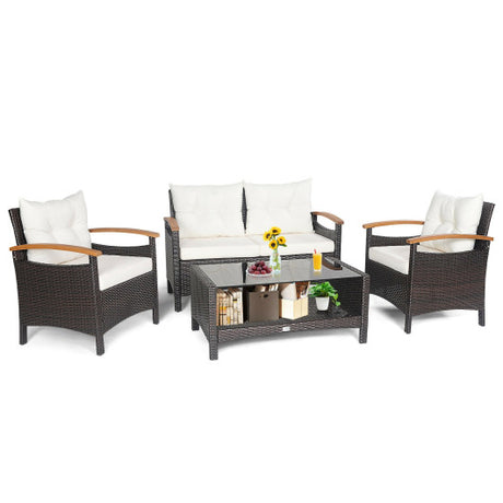 4 Pieces Patio Rattan Furniture Set with Cushioned Sofa and Storage Table-White