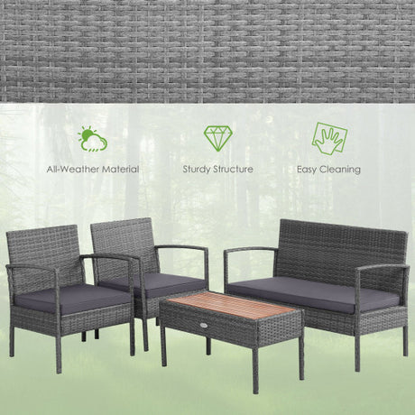 4 Pieces Patio Rattan Cushioned Furniture Set with Wooden Tabletop