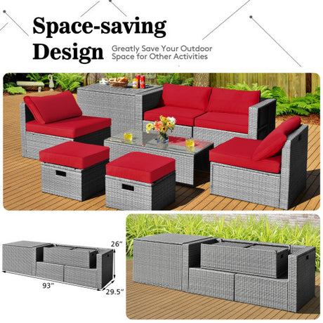 8 Pieces Patio Rattan Storage Table Furniture Set-Red