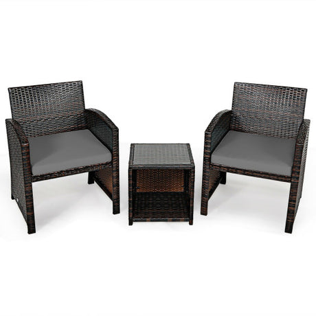 3 Pieces PE Rattan Wicker Furniture Set with Cushion Sofa Coffee Table for Garden-Gray