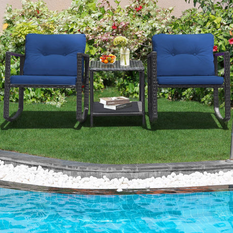 3 Pcs Patio Rattan Set Rocking Chair Cushioned Sofa Garden Furniture-Navy