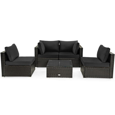 6 Pieces Patio Rattan Furniture Set with Cushions and Glass Coffee Table-Black