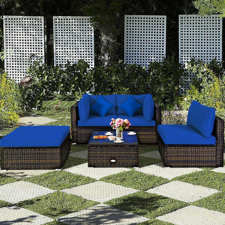 5 Pcs Outdoor Patio Rattan Furniture Set Sectional Conversation with Navy Cushions-Navy