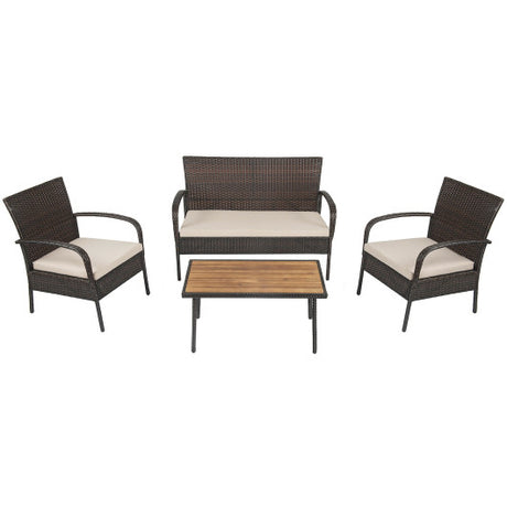 4 Pieces Patio Cushioned Wicker Conversation Set with Acacia Wood Tabletop