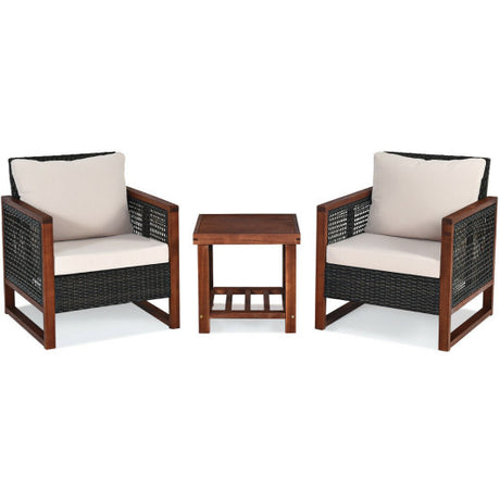 3 Pieces Patio Wicker Furniture Set with Washable Cushion and Acacia Wood Coffee Table-Beige