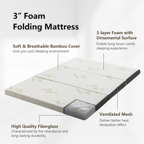 Queen 3 Inch Tri-fold Memory Foam Floor Mattress Topper Portable with Carrying Bag-M