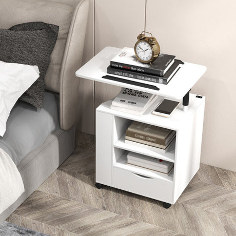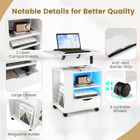 Nightstand Bedside Table Swivel Laptop Tray with Charging Station and LED Lights-White