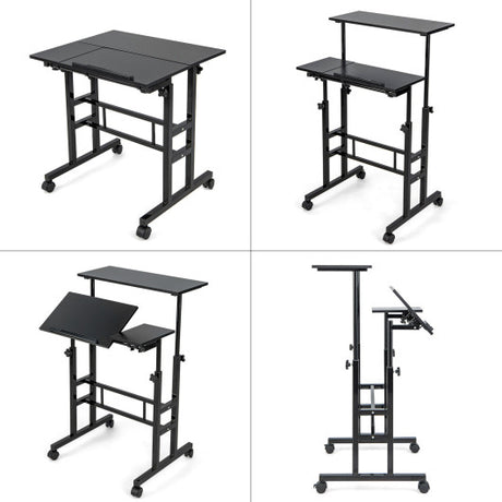 Mobile Stand up Computer Desk with 2 Tilting Desktops-Black