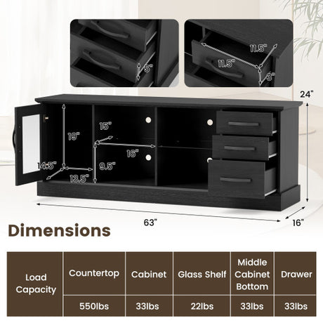 63 Inches Media Console Table with 3 Drawers and 2 Glass Shelves-Black
