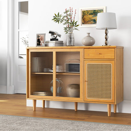 Modern Bamboo Buffet Sideboard Cabinet with Tempered Glass Sliding Doors-Natural