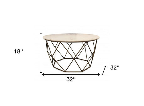 32" Ivory and Brass Genuine Marble and Metal Round Frame Coffee Table