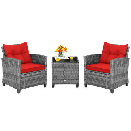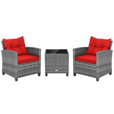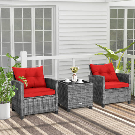 3 Pieces Outdoor Wicker Conversation Set with Tempered Glass Tabletop-Red