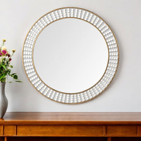 42" Round Gold Metal Frame Wall Mirror With White Wood Beads