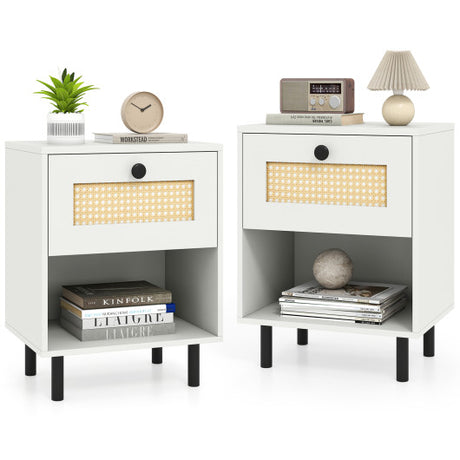 Rattan Nightstand Boho End Table with Rattan Drawer and Open Shelf Set of 2-White