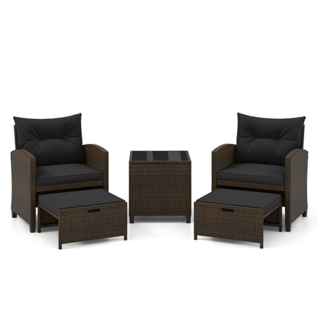 5 Pieces Patio Rattan Furniture with 2 Ottomans and Tempered Glass Coffee Table-Black
