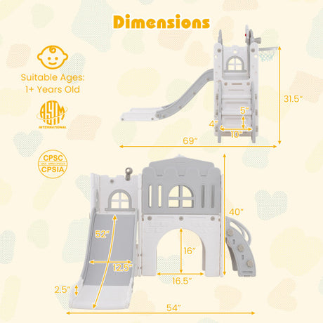 9-in-1 Toddler Slide L-Shaped with Basketball Hoop and Steering Wheel-Gray