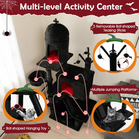 Gothic Cat Tree with 2 Cat Condos and Spooky Dangling Ball for Indoor Cats-Black