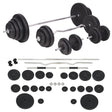 This versatile barbell and dumbbell set is perfect for chest, biceps, arms, triceps and back muscles. It includes two 33.1 lb. plates, two 22 lb. plates, two 16.5 lb. plates, four 11 lb. plates, six 5.5 lb. plates, six 2.8 lb. plates, two barbell bar and two dumbbell bar and has a total weight of about 264.6 lb.
