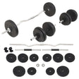 This versatile barbell and dumbbell set is perfect for chest, biceps, arms, triceps and back muscles. It includes two 11 lb. plates, four 4.4 lb. plates, four 2.8 lb. plates, one barbell bar and two dumbbell bar and has a total weight of about 66.1 lb.