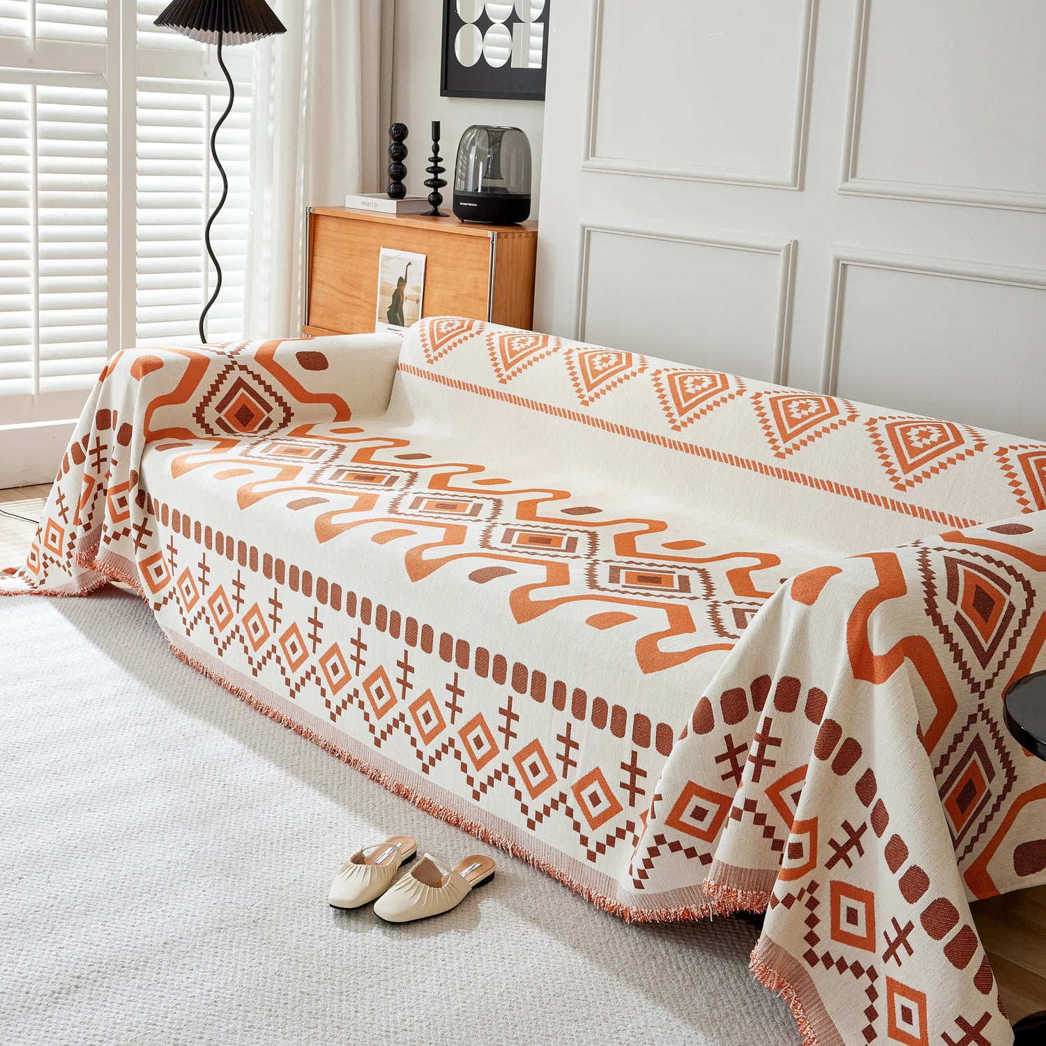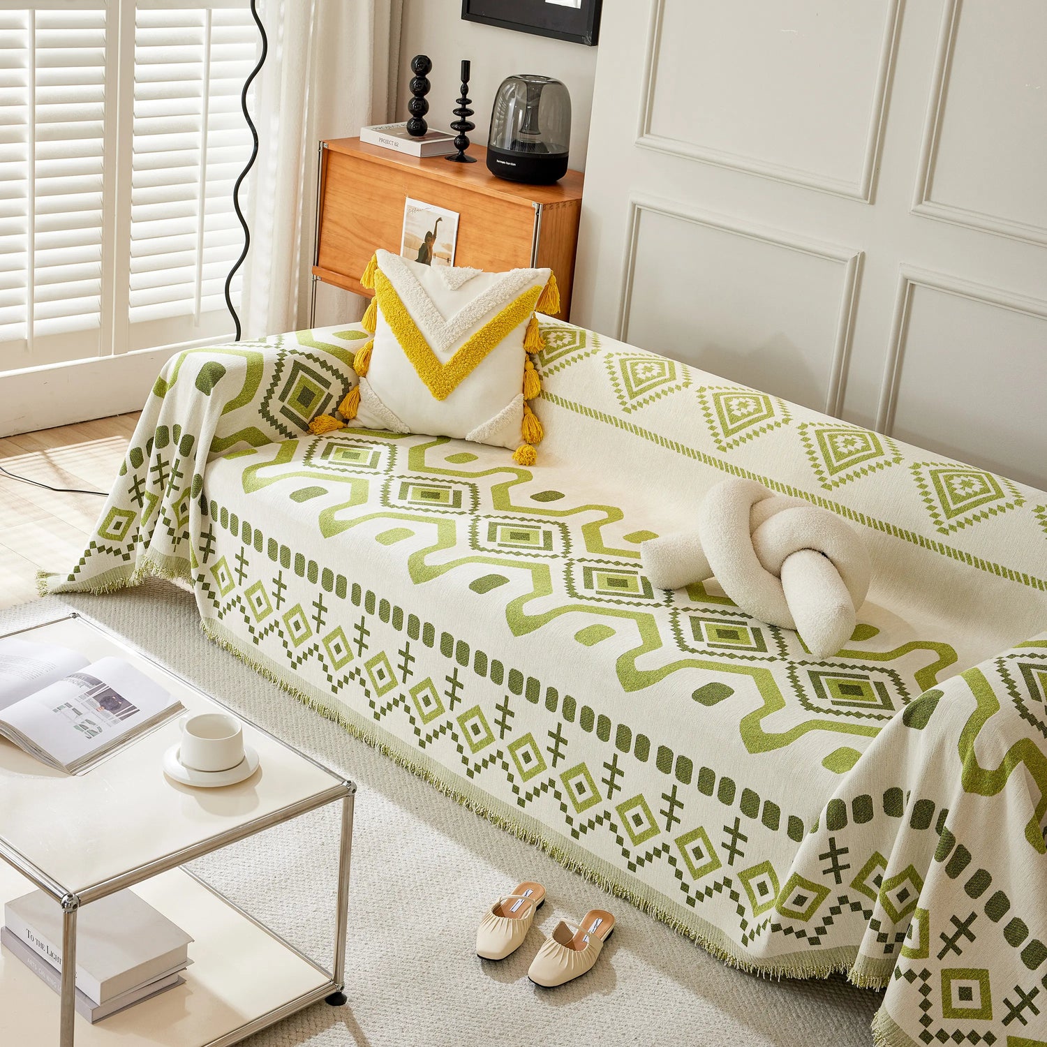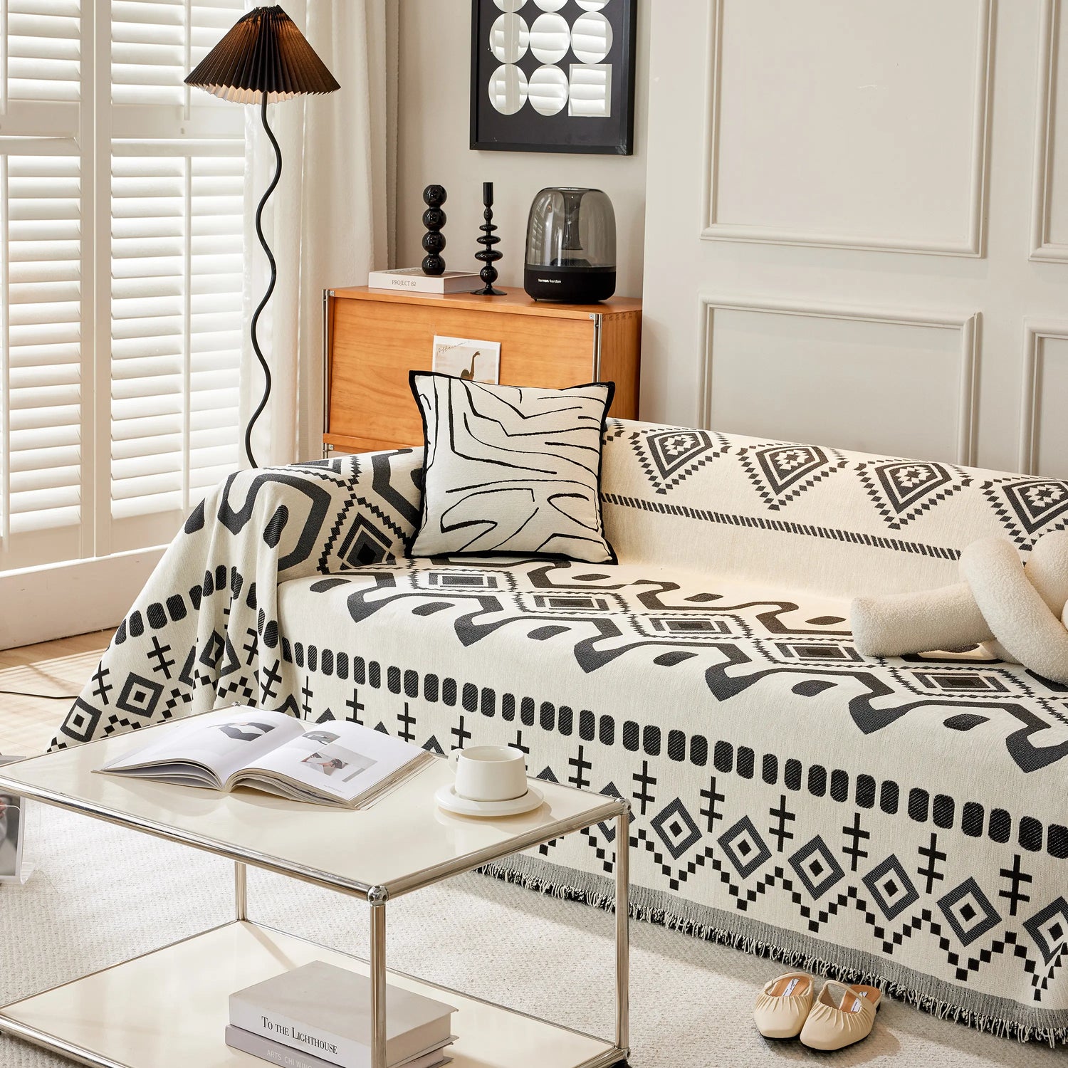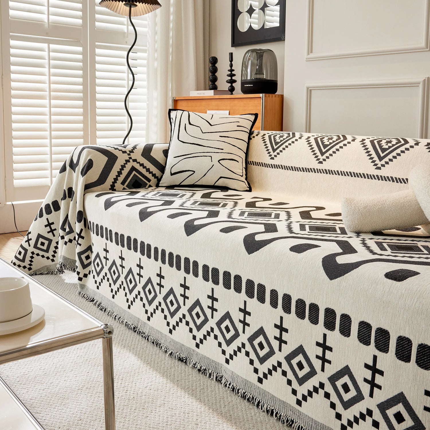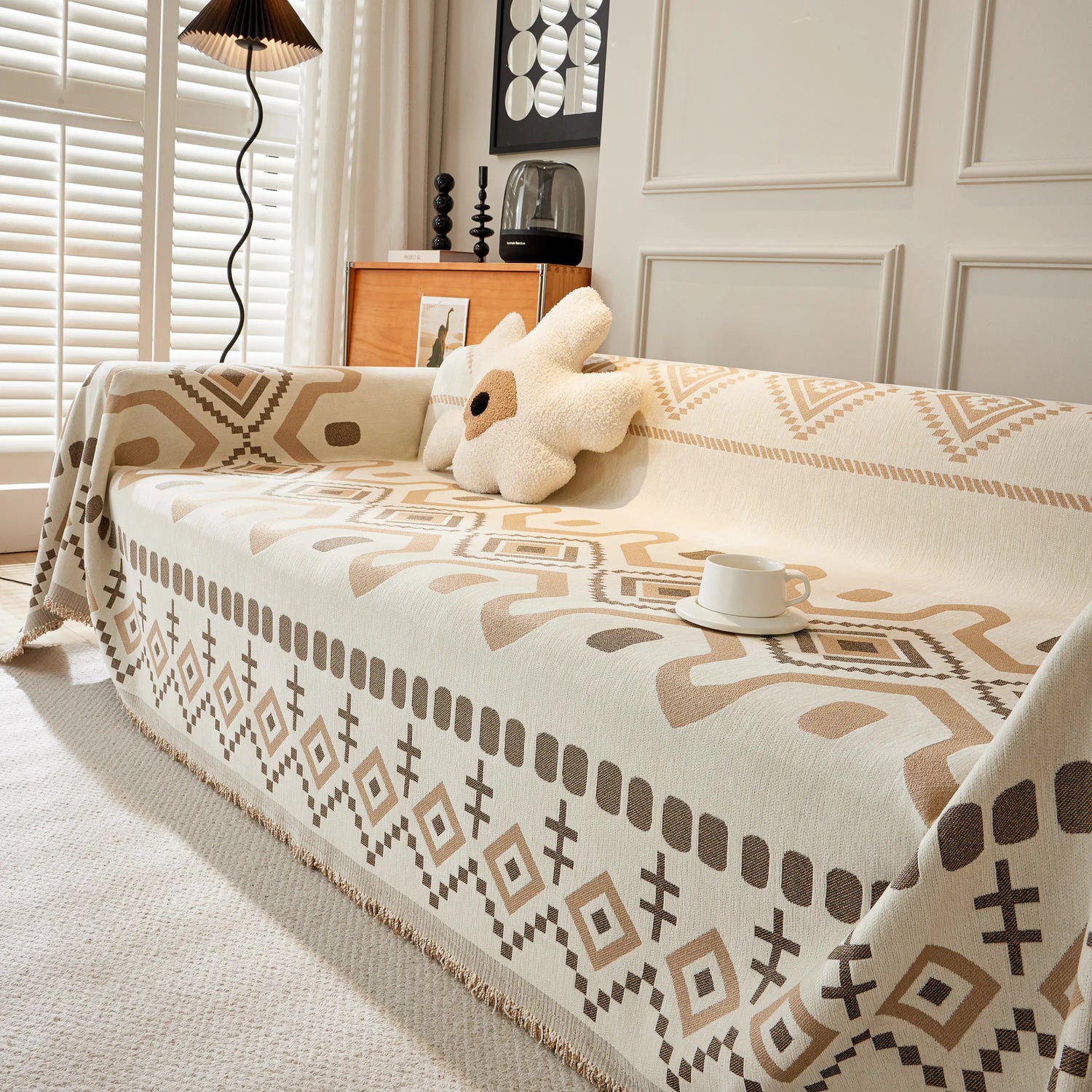 This boho geometric chenille throw sofa cover features soft, textured fabric with a stylish design. It provides full coverage while remaining breathable and comfortable. Ideal as a decorative couch blanket or furniture protector, it adds a cozy and modern touch to any living space. Machine washable for easy care.