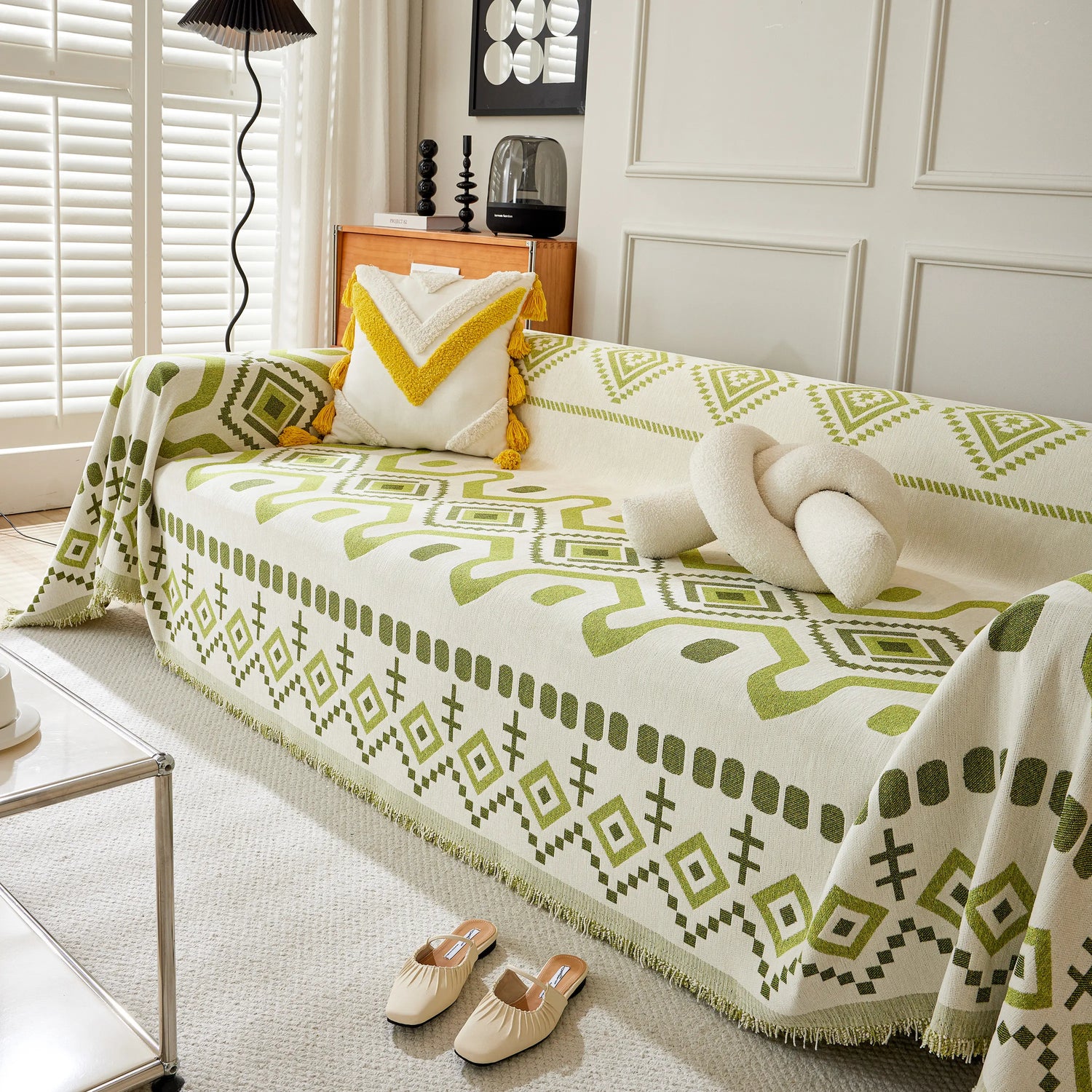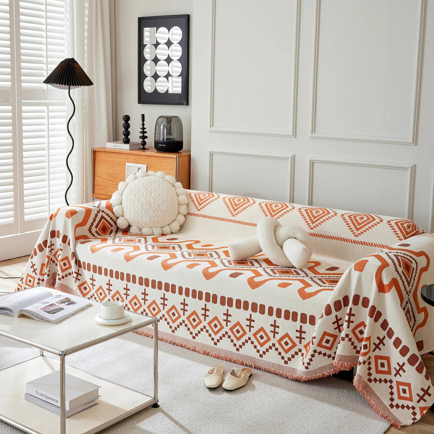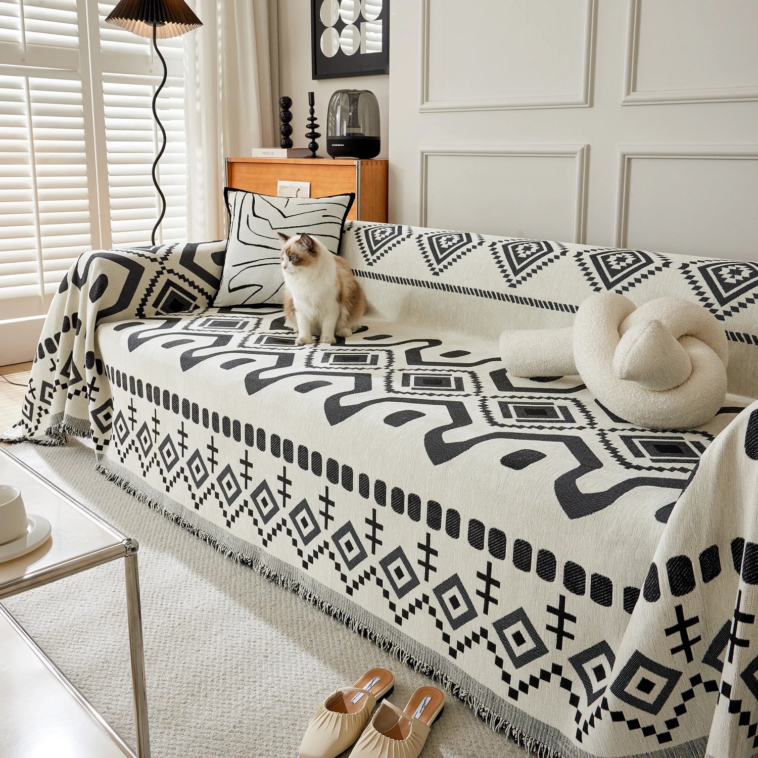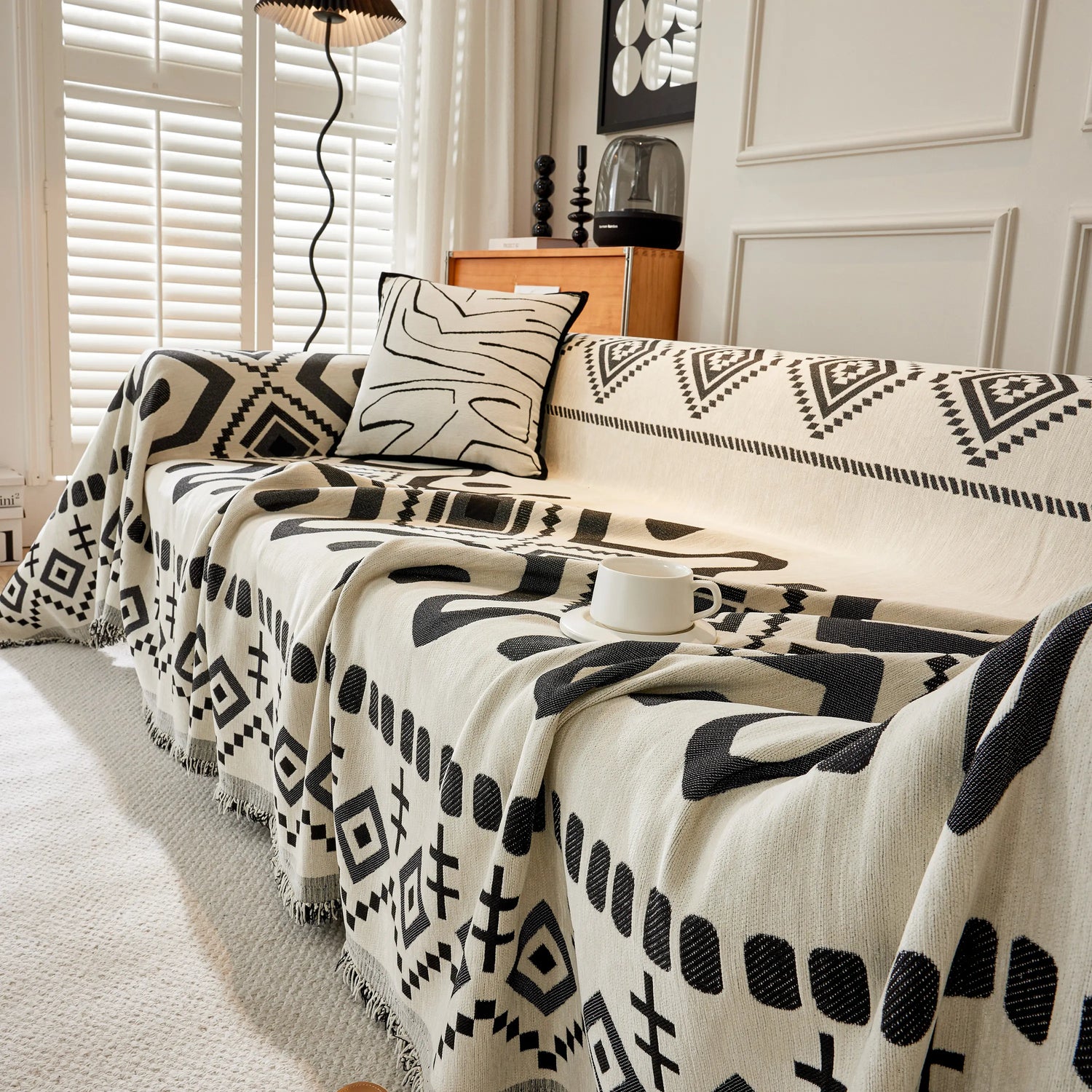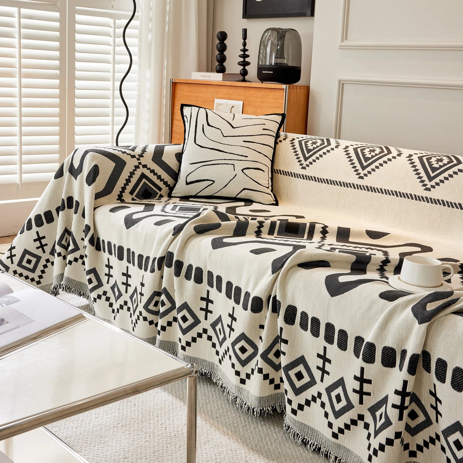 This boho geometric chenille throw sofa cover features soft, textured fabric with a stylish design. It provides full coverage while remaining breathable and comfortable. Ideal as a decorative couch blanket or furniture protector, it adds a cozy and modern touch to any living space. Machine washable for easy care.