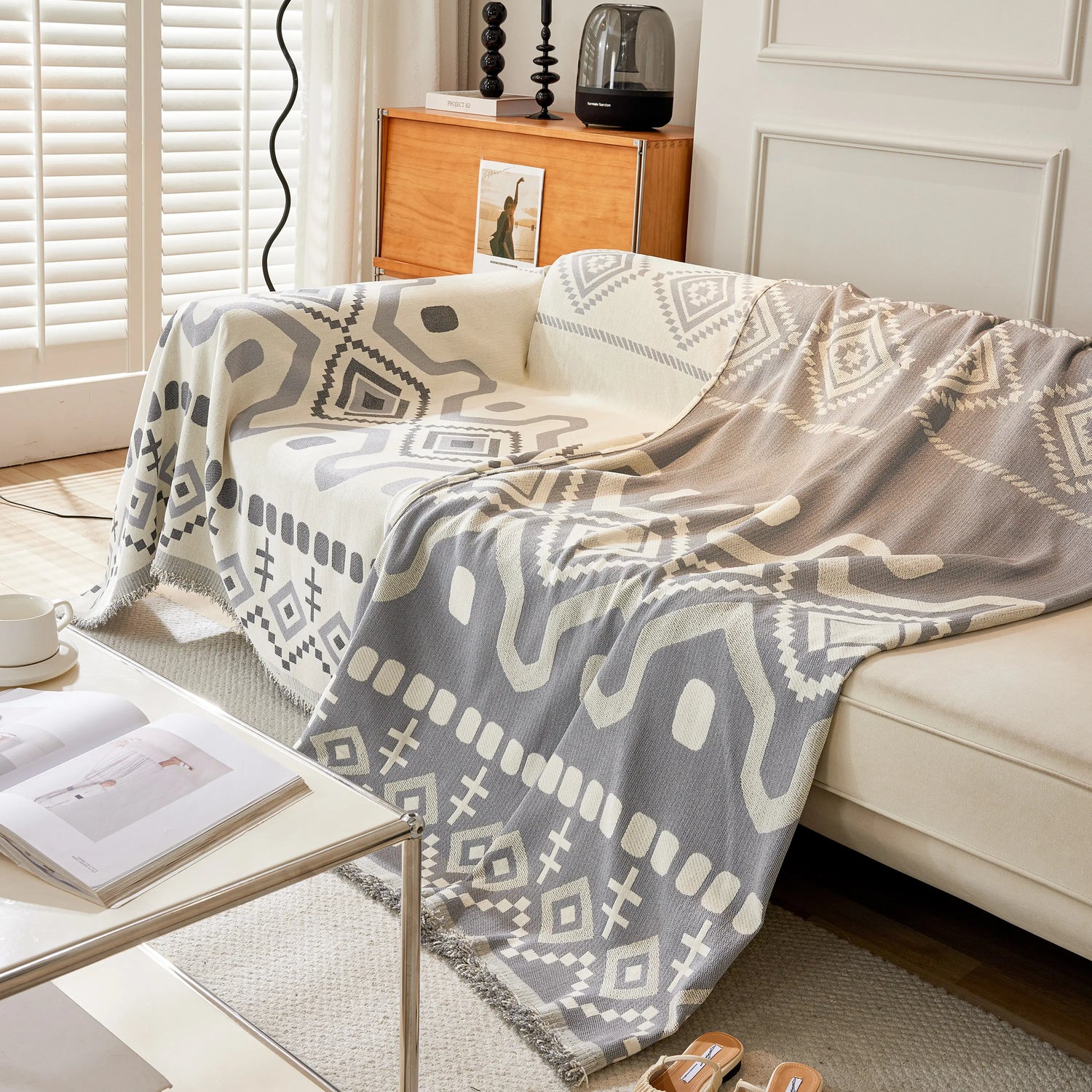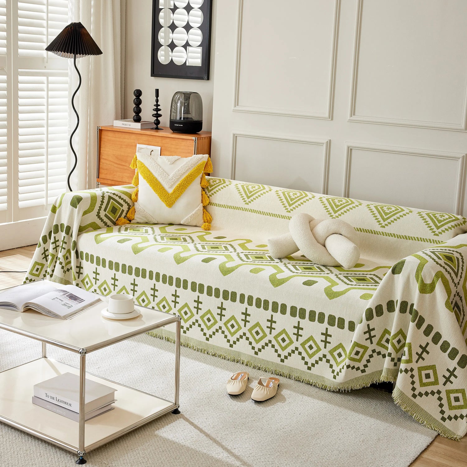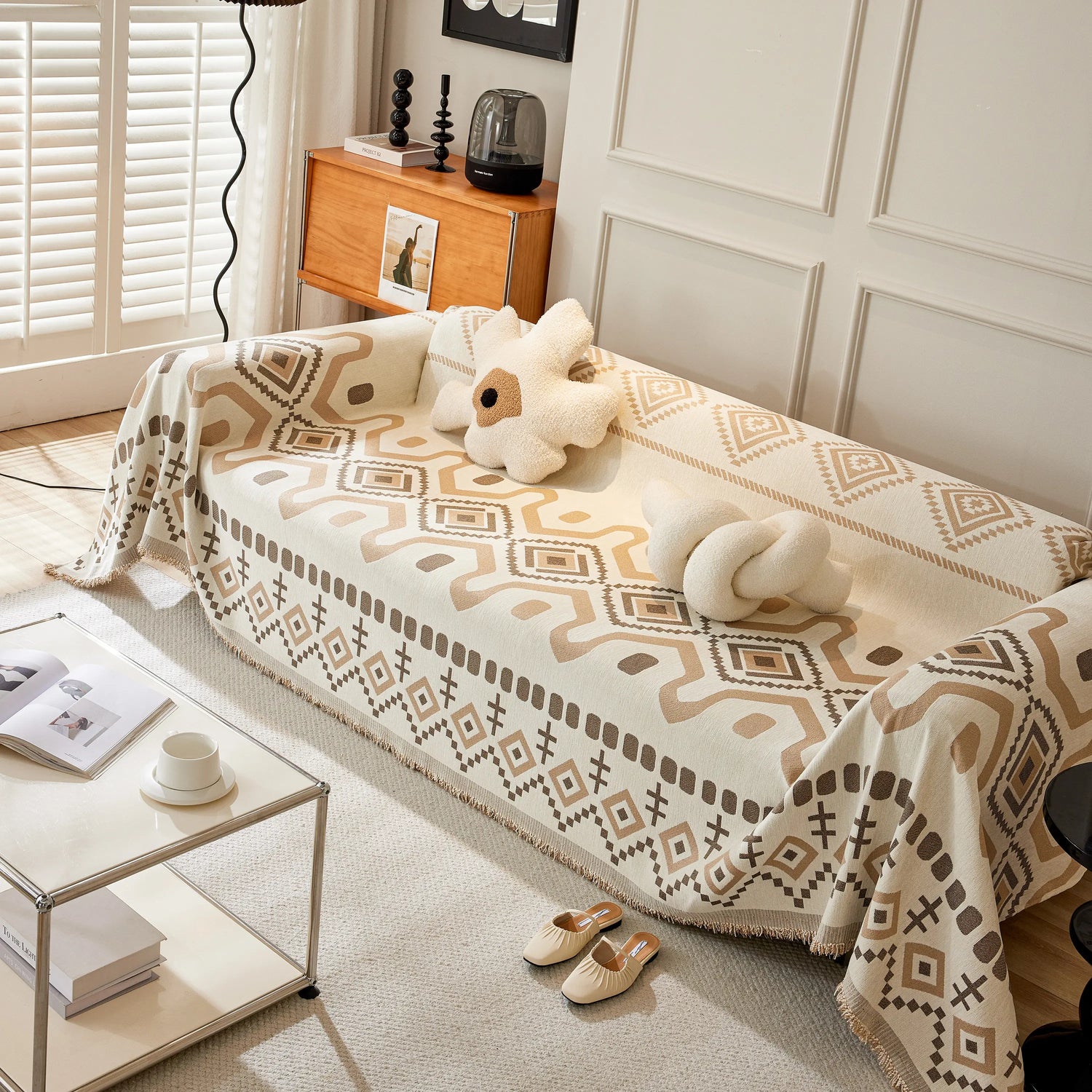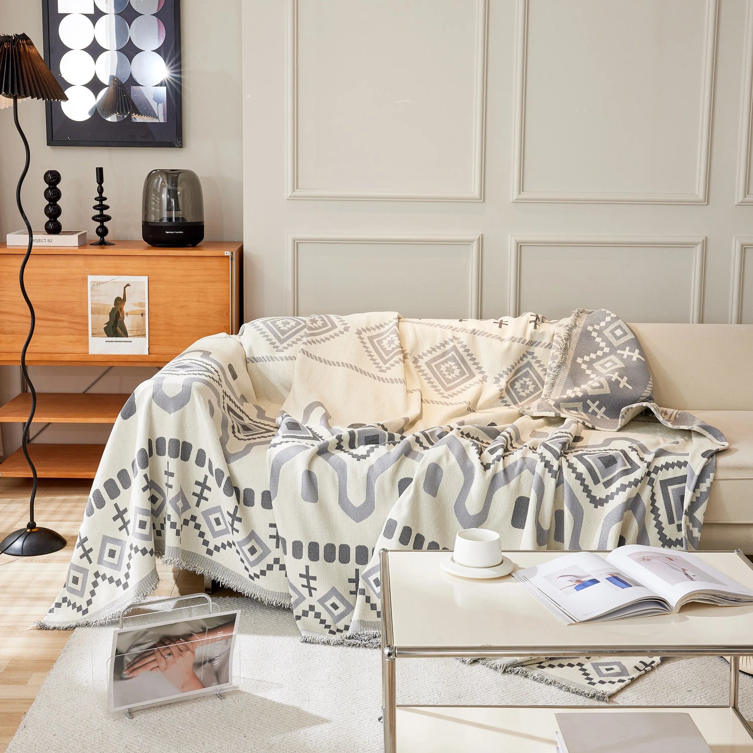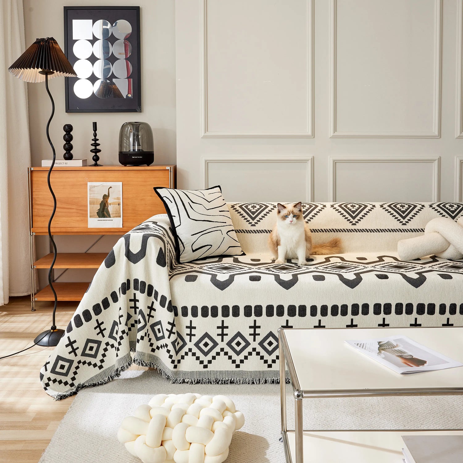 This boho geometric chenille throw sofa cover features soft, textured fabric with a stylish design. It provides full coverage while remaining breathable and comfortable. Ideal as a decorative couch blanket or furniture protector, it adds a cozy and modern touch to any living space. Machine washable for easy care.