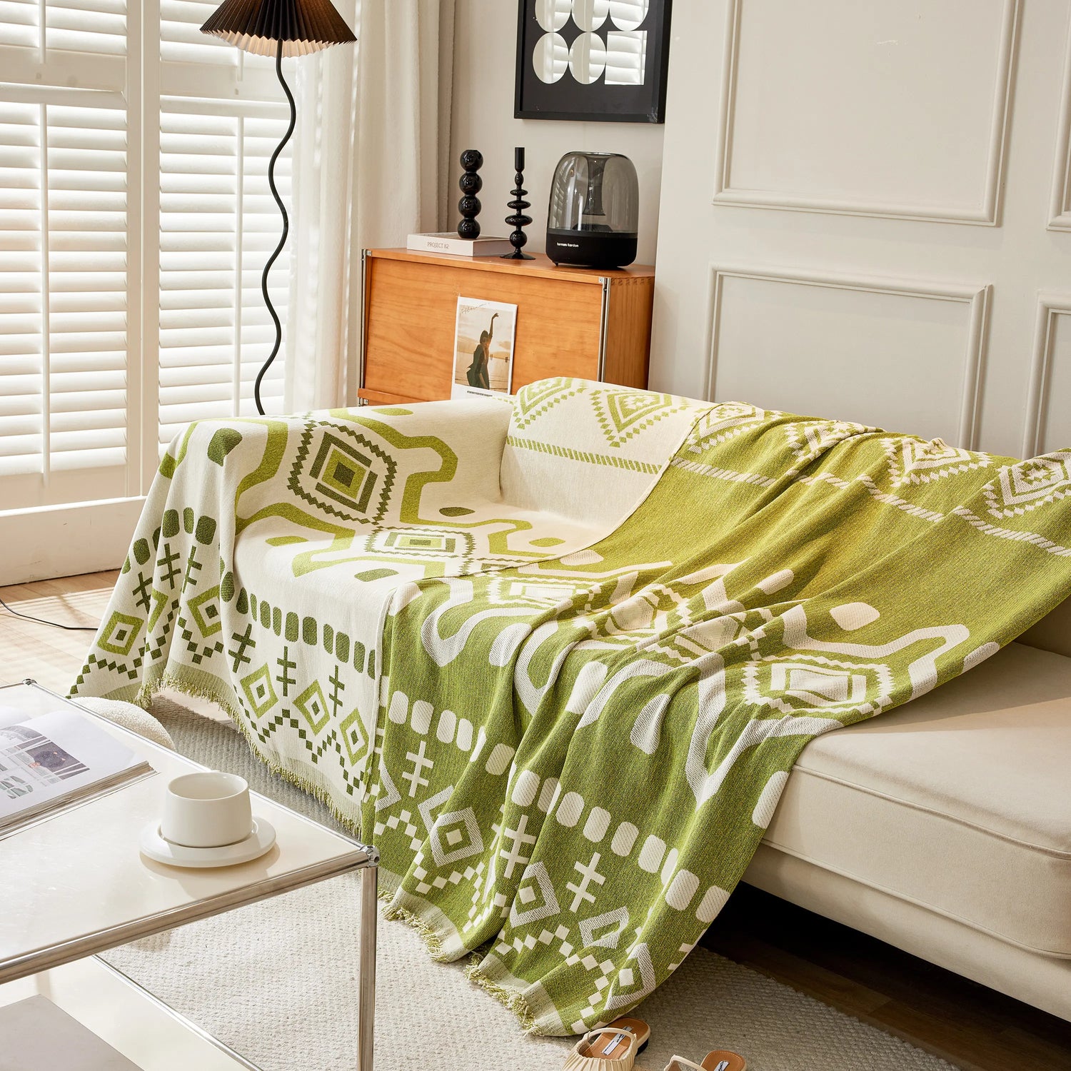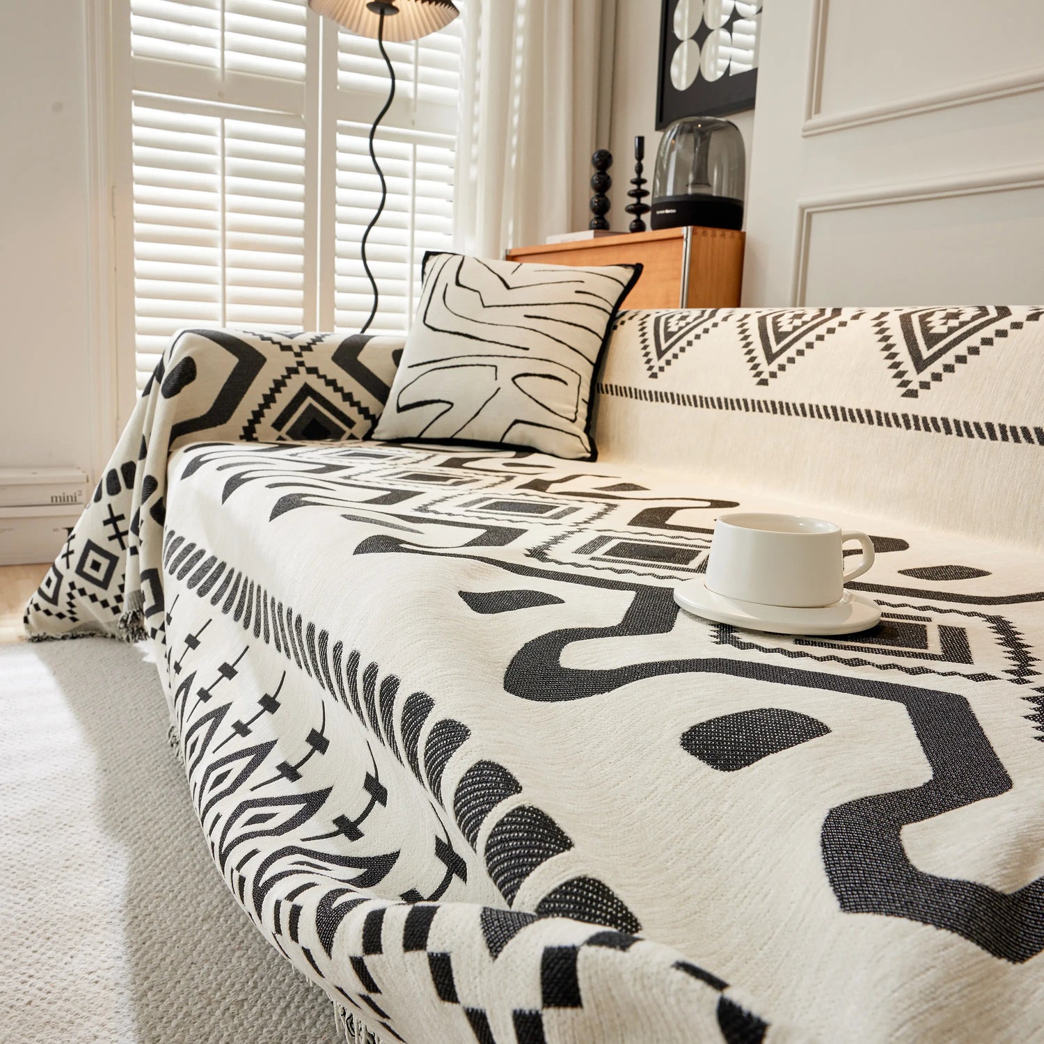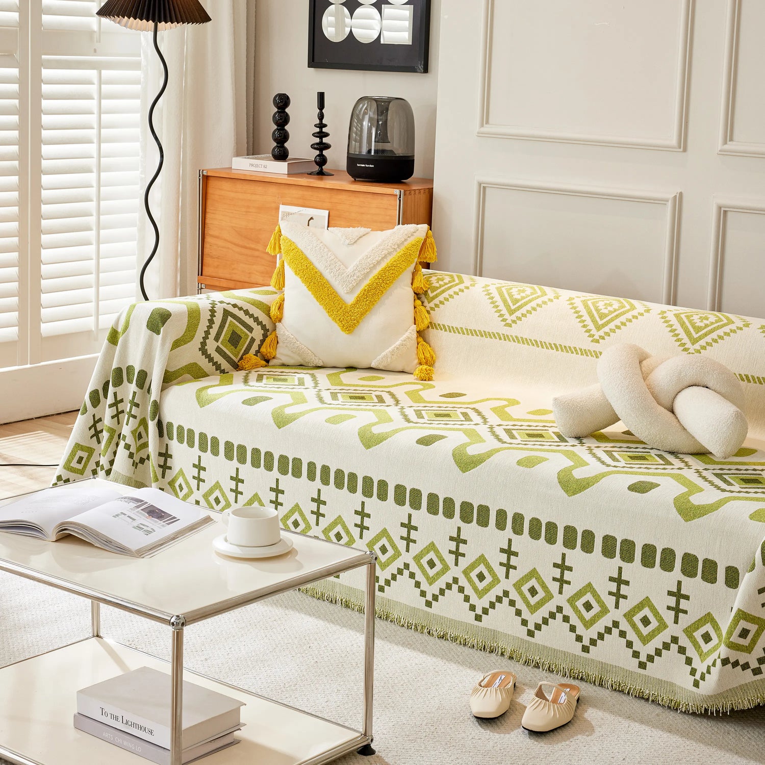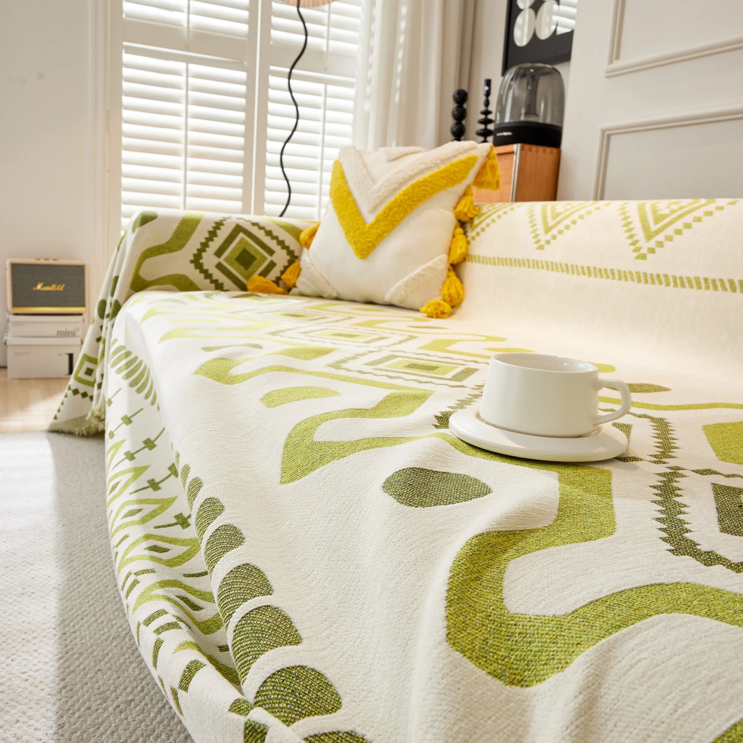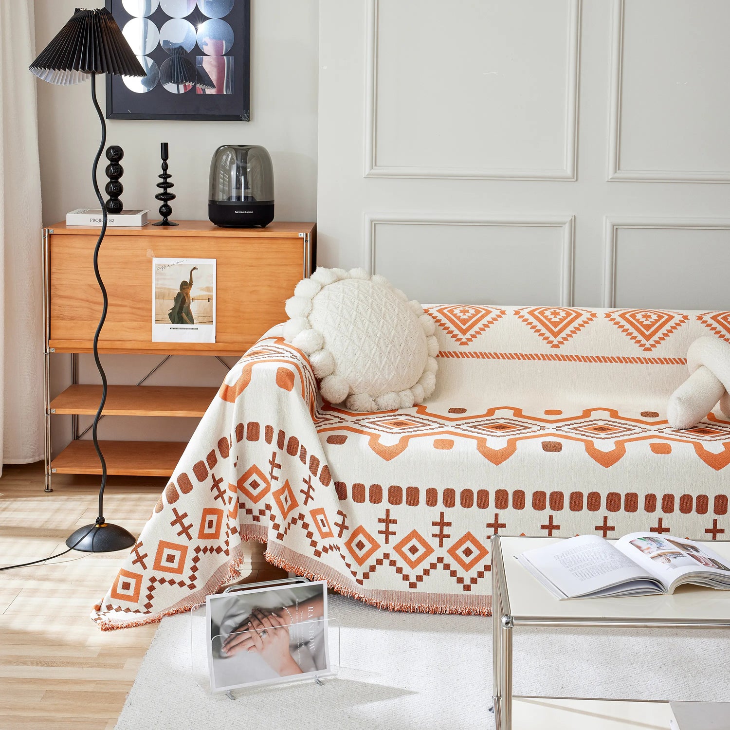 This boho geometric chenille throw sofa cover features soft, textured fabric with a stylish design. It provides full coverage while remaining breathable and comfortable. Ideal as a decorative couch blanket or furniture protector, it adds a cozy and modern touch to any living space. Machine washable for easy care.