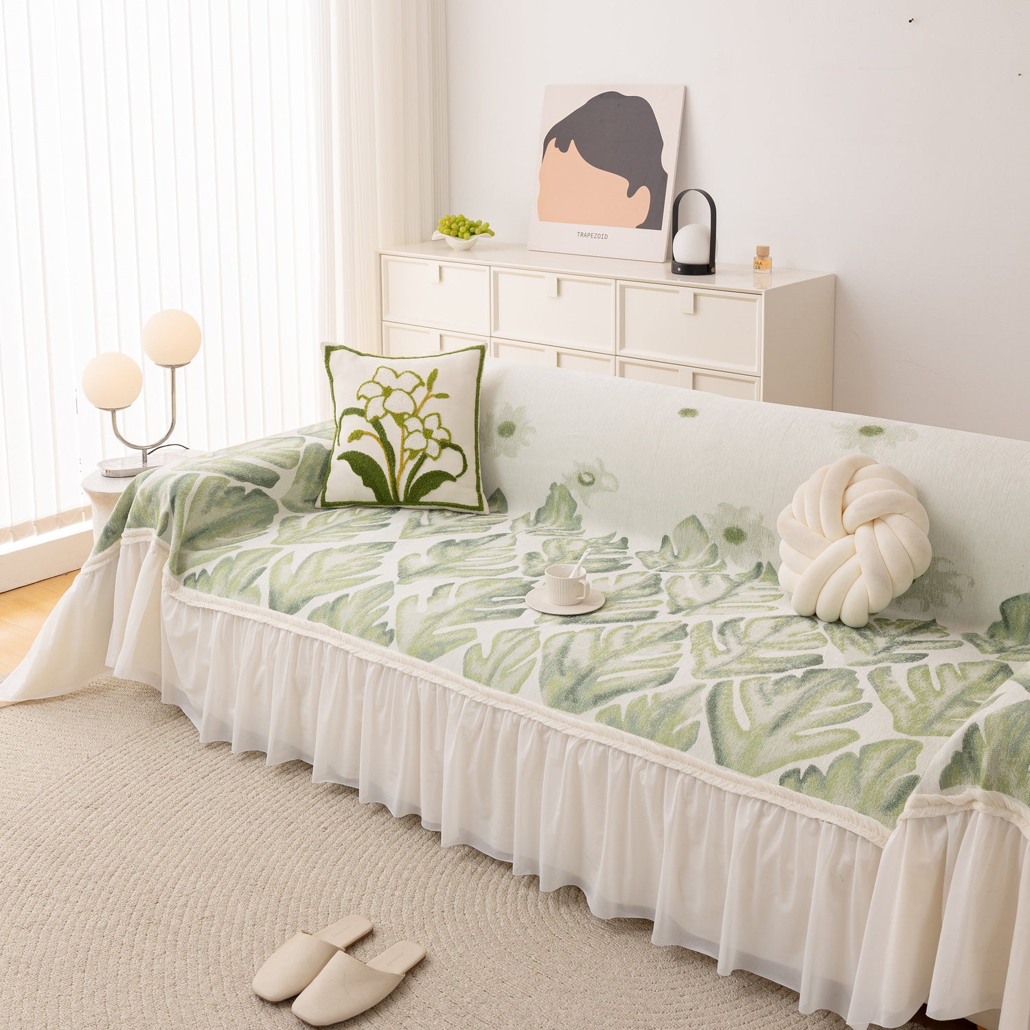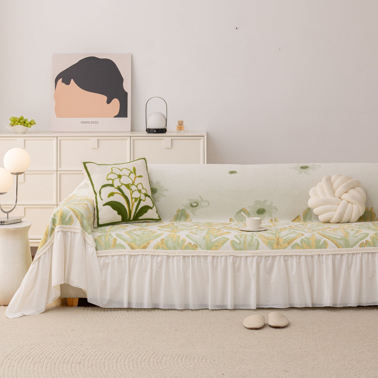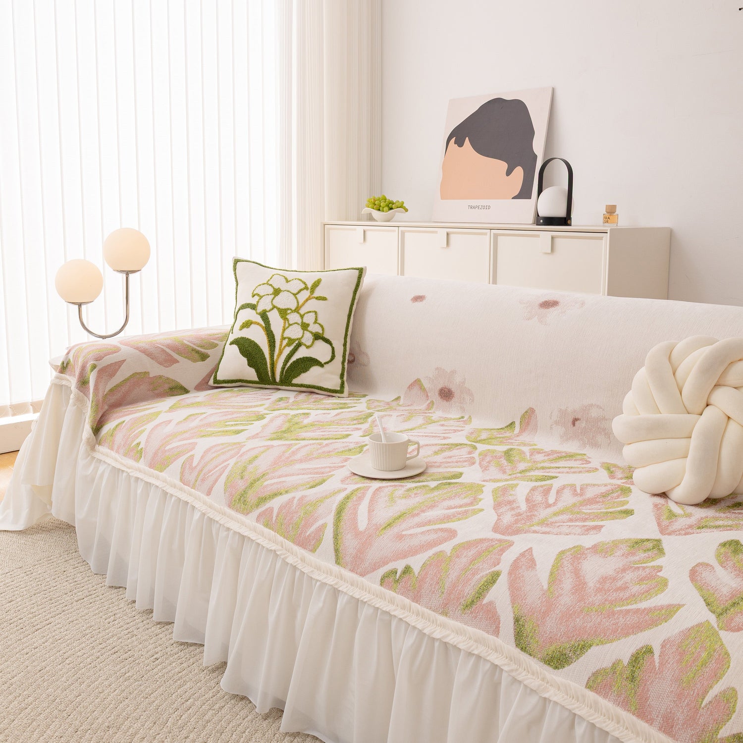 Botanical Sofa Cover with Chiffon Skirt, Floral Couch Throw Blanket for All-Season