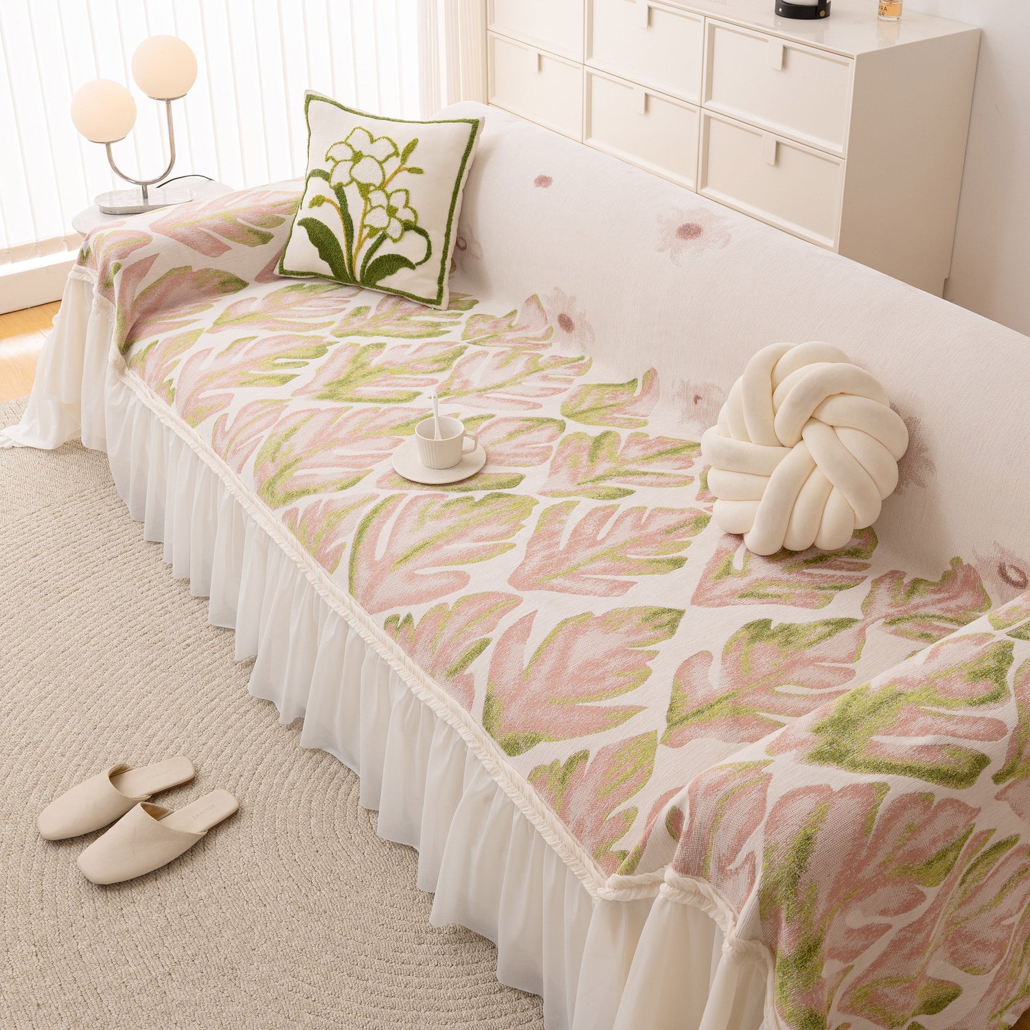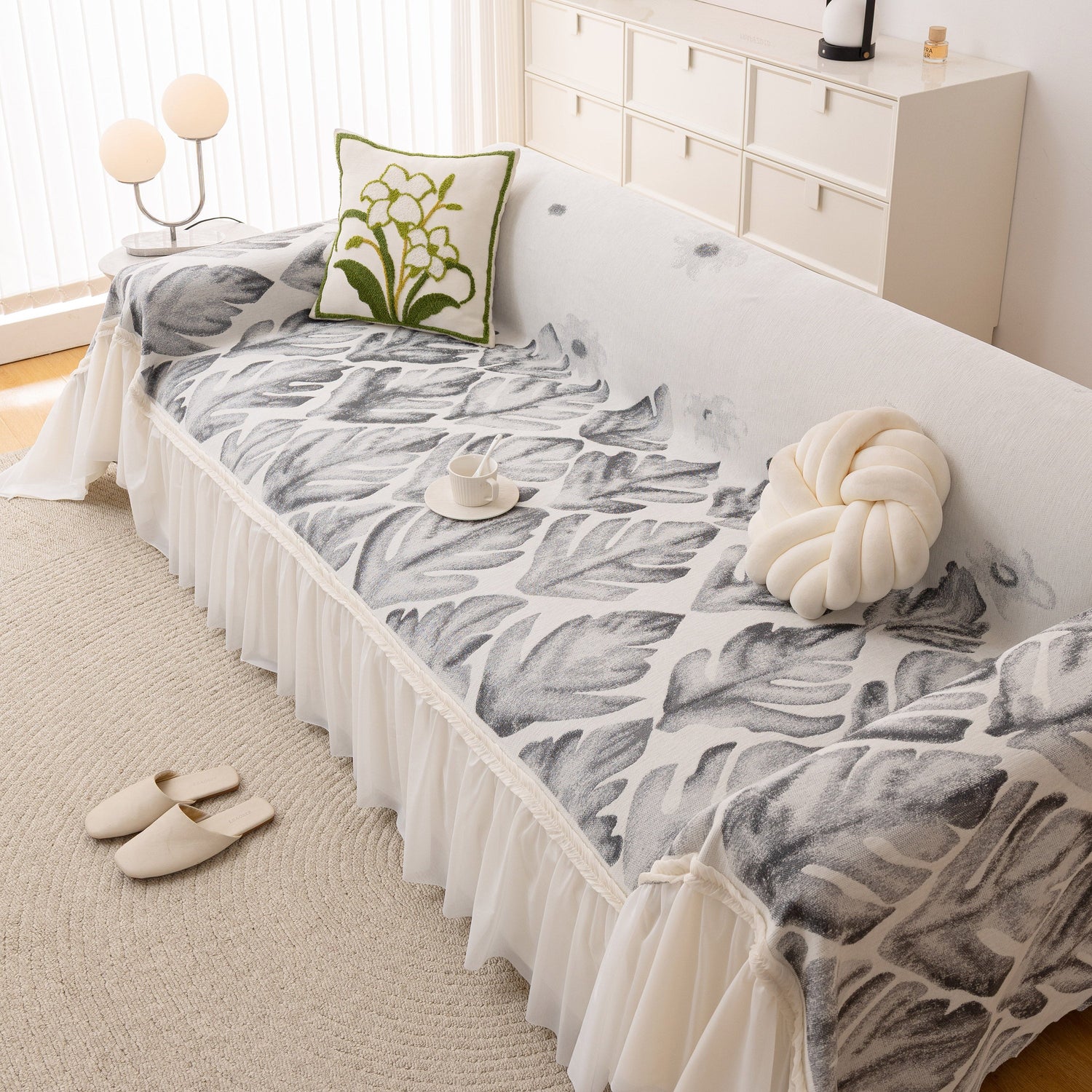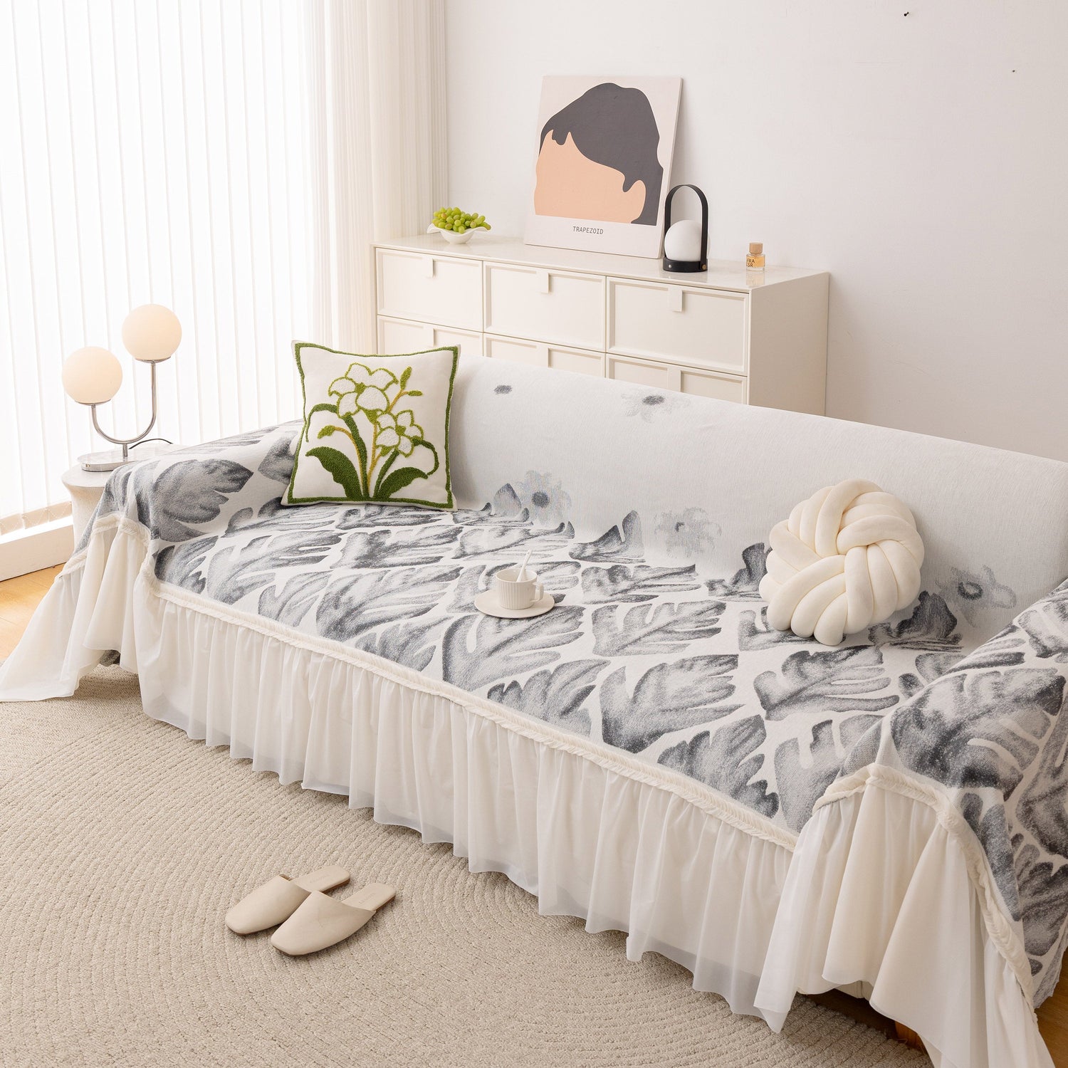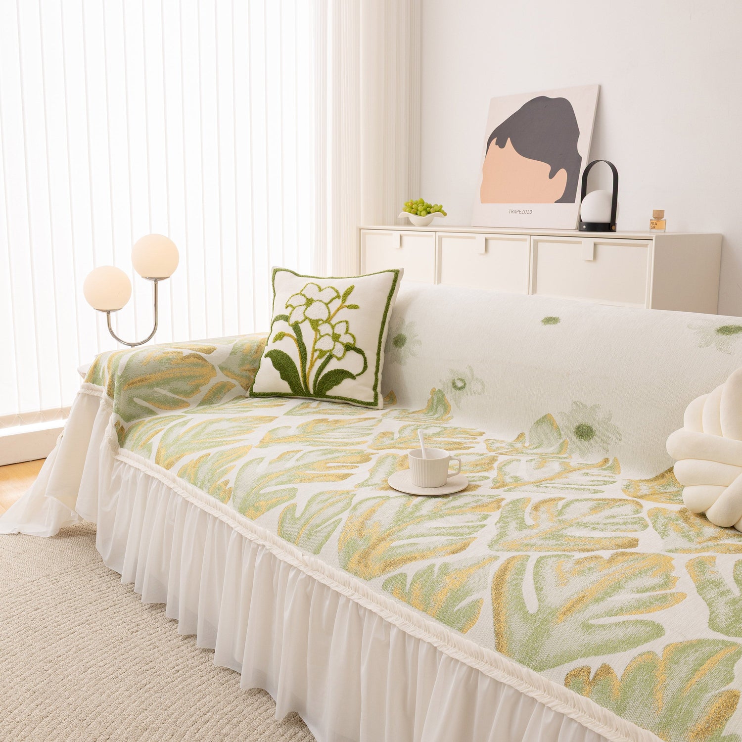 Botanical Sofa Cover with Chiffon Skirt, Floral Couch Throw Blanket for All-Season